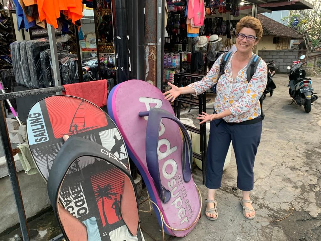 Das ist auch verflixt praktisch, wenn du durch die Stadt läufst und dann in einen Tempel oder ein privates Haus rein gehst. Alle ziehen automatisch vor der Tür die Badelatschen aus. Da hast du als Westeuropäischer Turnschuh-Socken-Träger echt den Geschwindigkeitsnachteil. Ist Fakt. Während die flinken Balinesen und assimilierte Gäste rasch aus ihren Schlappen schlüpfen, sind die anderen noch am Schuhe aufschnüren. Eindeutiger Nachteil und ein klares Argument für eine Asienreise in Badelatschen.