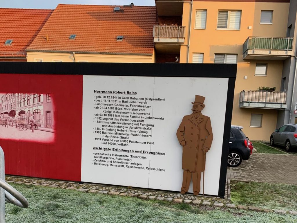 Ich pilger so durch Bad Liebenwerda, wo unser Hauptquartier ist, wenn wir nicht im Kundenauftrag unterwegs sind und da seh ich es: Das Geschäftshaus von Robert Reiss. Der Kartograph beim Königlichen Katasteramt war nicht nur Kartograf, er war auch Unternehmer. Und um es sich und den anderen Kartografen und Technischen Zeichnern einfacher zu machen, erfand er die Reisszwecke, die Reissschiene, und das Reissbrett… Mehrere 10.000 Pakete versandte er  1909 (!!!) schon aus der kleinen Stadt an der Schwarzen Elster.