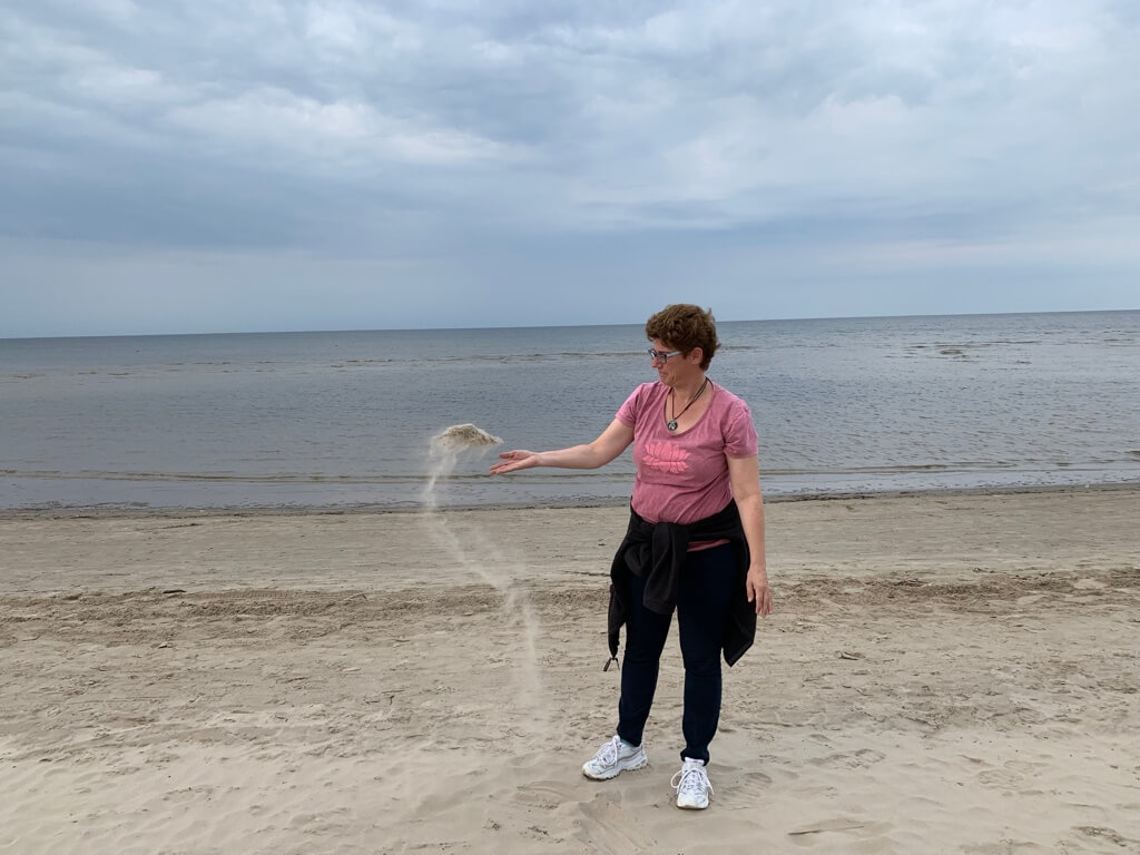 Guck mal auf das Bild. Das ist am Strand von Estland und ich habe den Sand dressiert. Guck doch mal, wie er meinen Handbewegungen folgt, er frisst mir aus der Hand.